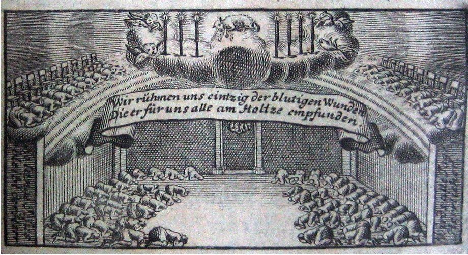 Herrnhuter fallen nieder zum Gebet. Titelkupfer: Christliches Gesangbuch der evangelischen Brüder Gemeinen 1735